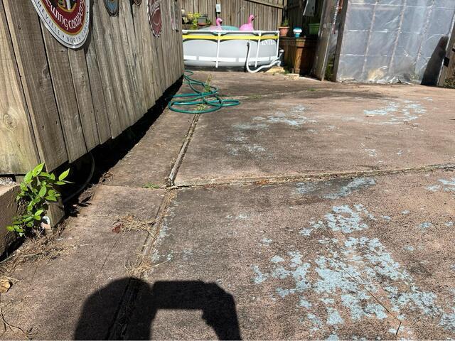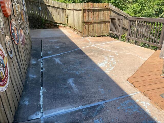 The patio showed clear signs of settlement, with uneven slabs, visible cracks, and separation along the joints. Areas of the concrete had sunk, creating an unlevel surface and potential safety concerns.
